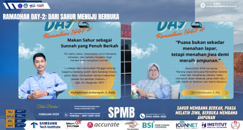 Melalui refleksi Quotes Ramadhan Day-2 ini, diharapkan seluruh keluarga besar SMK Muhammadiyah 1 Ajibarang semakin merasakan makna Ramadhan sebagai perjalanan spiritual dari sahur hingga berbuka, dari kesabaran menuju keberkahan.